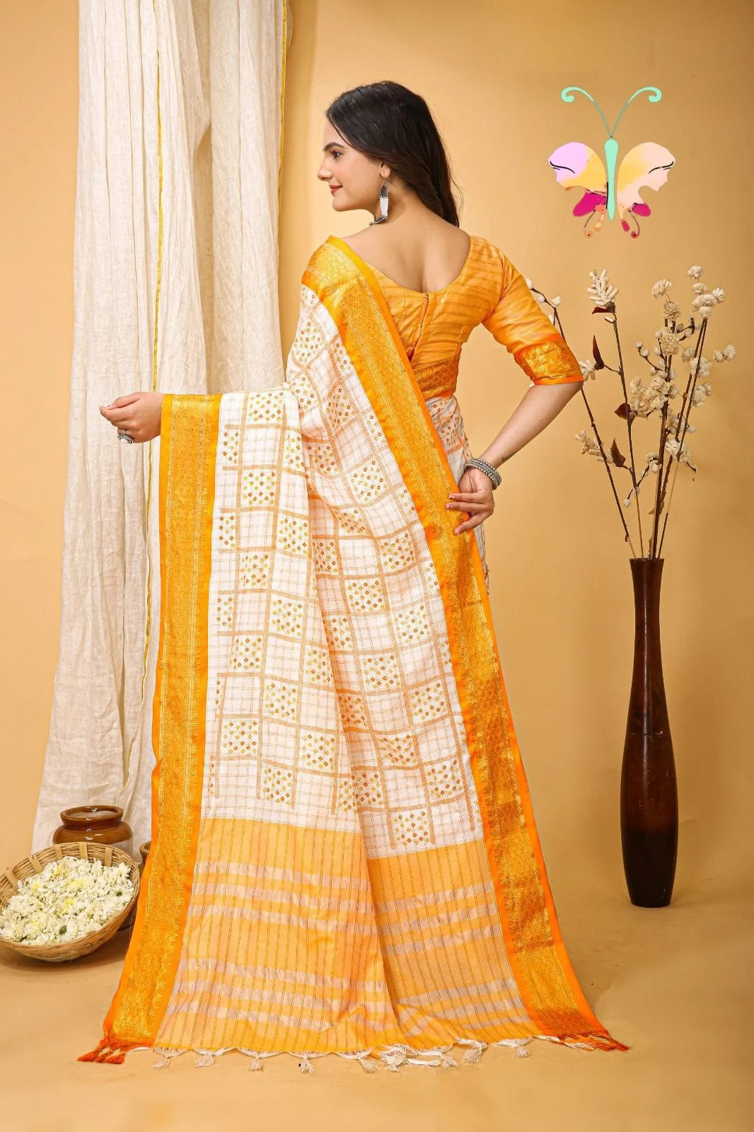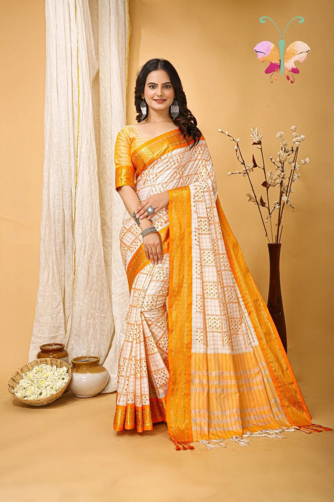 Saree :- Soft And pure cotton silk saree with zari weaving chex design all over the saree, block print on all over saree.