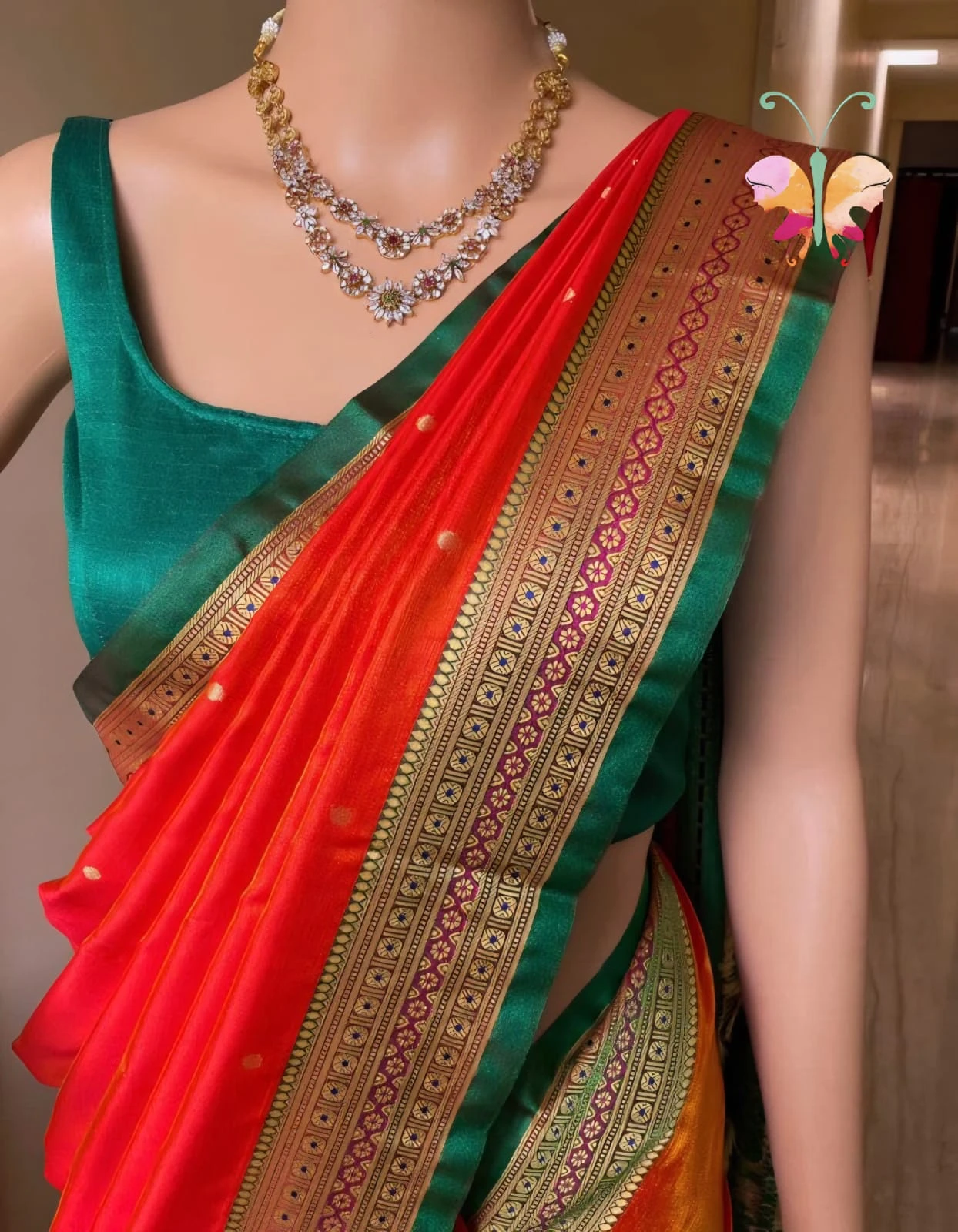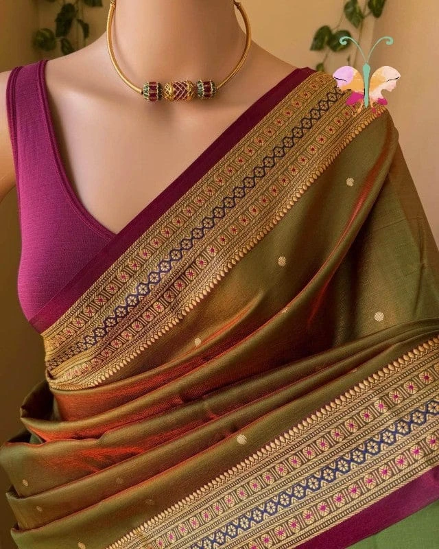 ORIGINAL PURE BANARASI ZARI AND RICH MINA WORK PALLU WITH ALL OVER BUTTI DESIGN AND HEAVY CONTRAST MULTI COLOUR BORDER