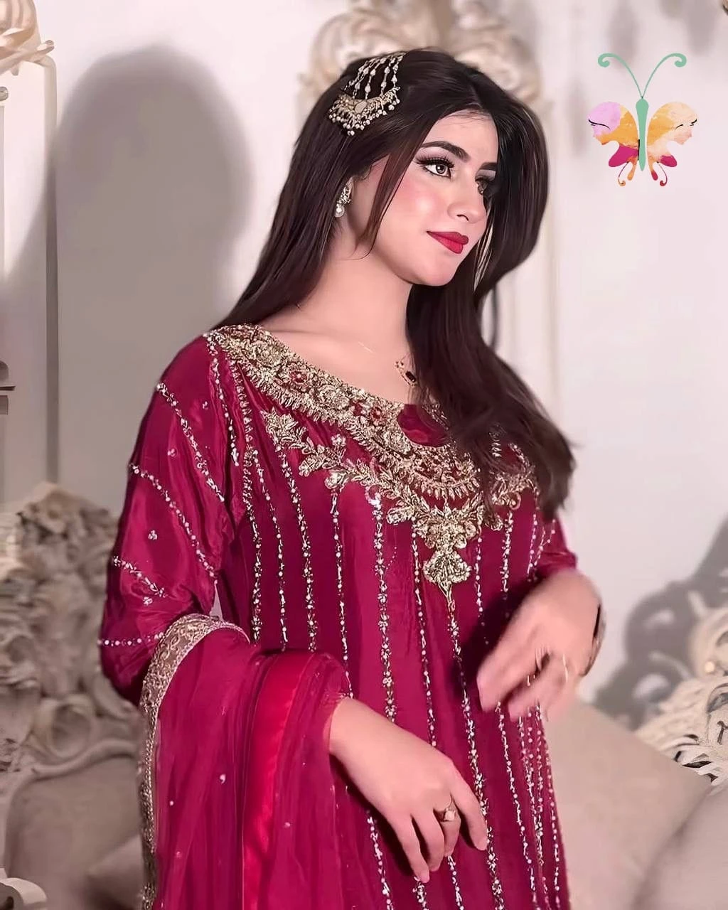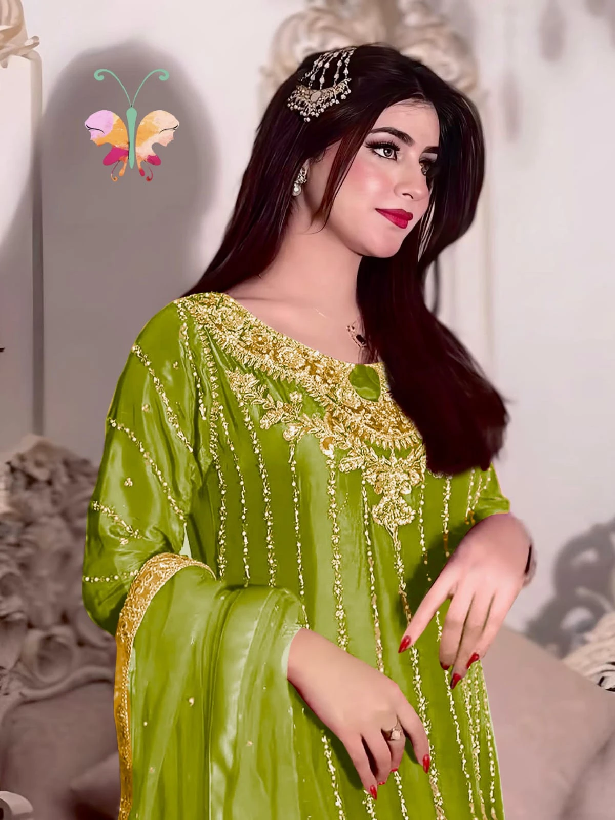Dupatta Fabric: Heavy Chinon Silk With Rivet Moti Work With Four Side Embroidery 5 mm Sequence Work Lace Border